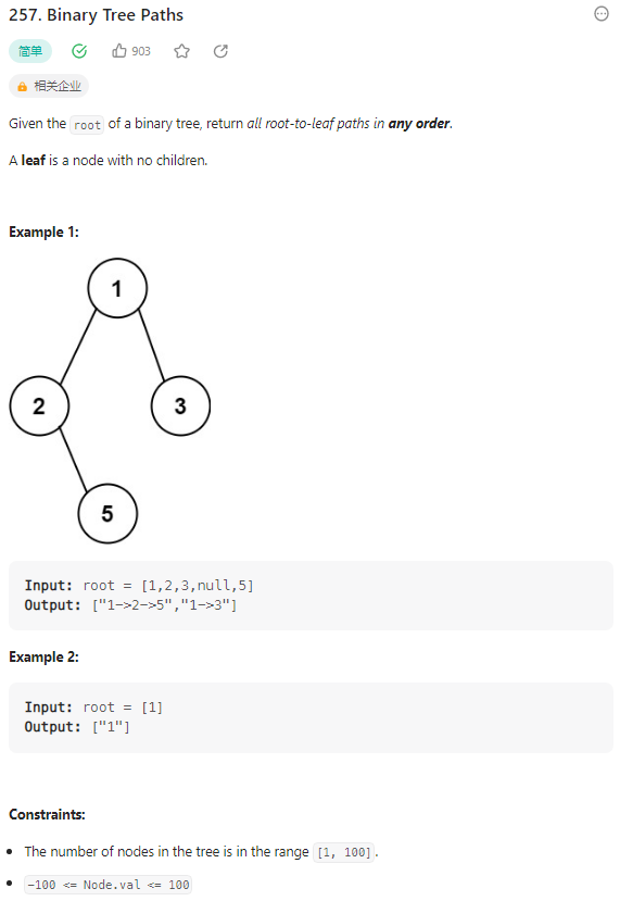| class Solution { private: void traversal(TreeNode *cur, vector<int> &path, vector<string> &result) { path.push_back(cur -> val); if (!(cur -> left) && !(cur -> right)) { string sPath; for (int i = 0; i < path.size() - 1; i++) { sPath += to_string(path[i]); sPath += "->"; } sPath += to_string(cur -> val); result.push_back(sPath); } if (cur -> left) { traversal(cur -> left, path, result); path.pop_back(); } if (cur -> right) { traversal(cur -> right, path, result); path.pop_back(); } } public: vector<string> binaryTreePaths(TreeNode* root) { vector<string> result; vector<int> path; if (!root) return result; traversal(root, path, result); return result; } };