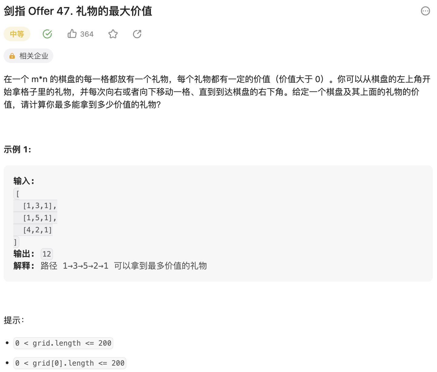 | class Solution { public: int maxValue(vector<vector<int>>& grid) { int m = grid.size(), n = grid[0].size(); for (int i = 0; i < m; i++) { for (int j = 0; j < n; j++) { if (i == 0 && j == 0) grid[i][j] = grid[i][j]; else if (i == 0 && j != 0) grid[i][j] = grid[i][j - 1] + grid[i][j]; else if (i != 0 && j == 0) grid[i][j] = grid[i - 1][j] + grid[i][j]; else grid[i][j] = grid[i][j] + max(grid[i - 1][j], grid[i][j - 1]); } } return grid[m - 1][n - 1]; } };